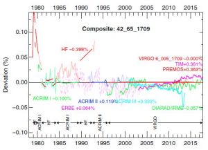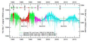 The TSI composite is referenced to the VIRGO rather than the SARR scale since version 4.2. The new characterisation of the VIRGO radiometer (see VIRGO_Char2Space) provides a new absolute scale which is about 5.8 W.m-2 or 0.42% lower than the original scale. Both scales are presented in Figures 4 and 5 as well as in the data files (composite here, and extended here). During the last solar minimum, TSI from VIRGO was 1359.66 ± 2.47 W.m-2 which is within less than half the uncertainty equal to that from TIM at 1360.52 W.m-2.