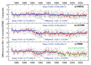 The comparison of the three composites with ERBE shows that the PMOD composite is the most consistent. So, if one believes the ERBE record, and with the Spearman’s rank correlation coefficient s of the PMOD, ACRIM and IRMB composites of 0.751, 0.678 and 0.695, respectively, it becomes clear which one should be chosen as a reliable estimate of the total solar irradiance for the last three solar cycles.